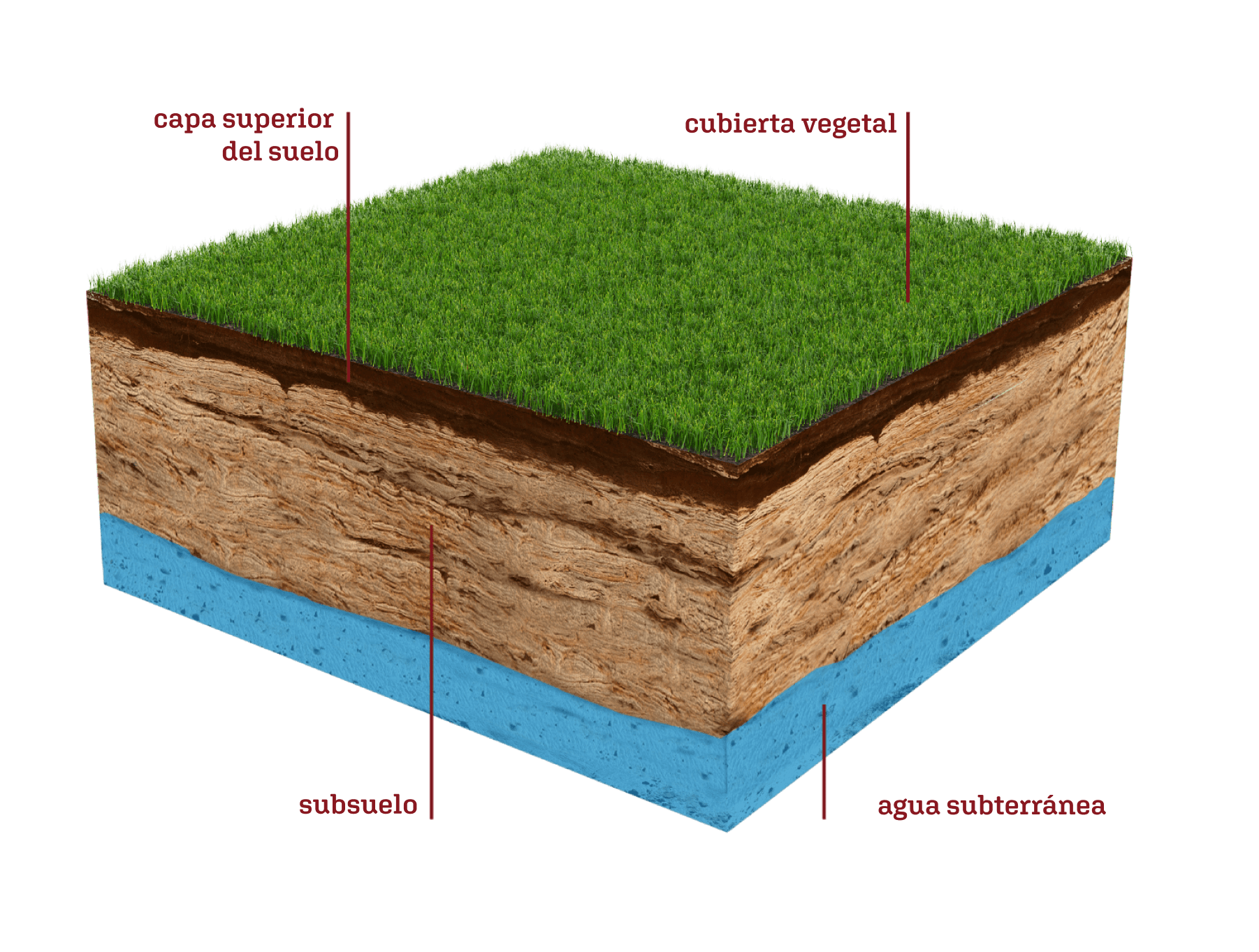 El ecosistema suelo es el intermediario entre la atmósfera y el material original (piedras, rocas, sedimentos...) o la masa de agua subterránea. La capa superficial del suelo, compuesta por grumos fértiles, está habitada por innumerables seres vivos y es también la fuente de alimento para las plantas (vegetación). En la capa más profunda, los procesos de meteorización liberan nutrientes de los materiales minerales del suelo, y en esa capa también se almacena y se filtra el agua. Las masas de agua subterránea son la reserva de agua potable más importante que existen en el planeta. La calidad de ese agua depende de la fertilidad, el uso y el aprovechamiento del suelo.